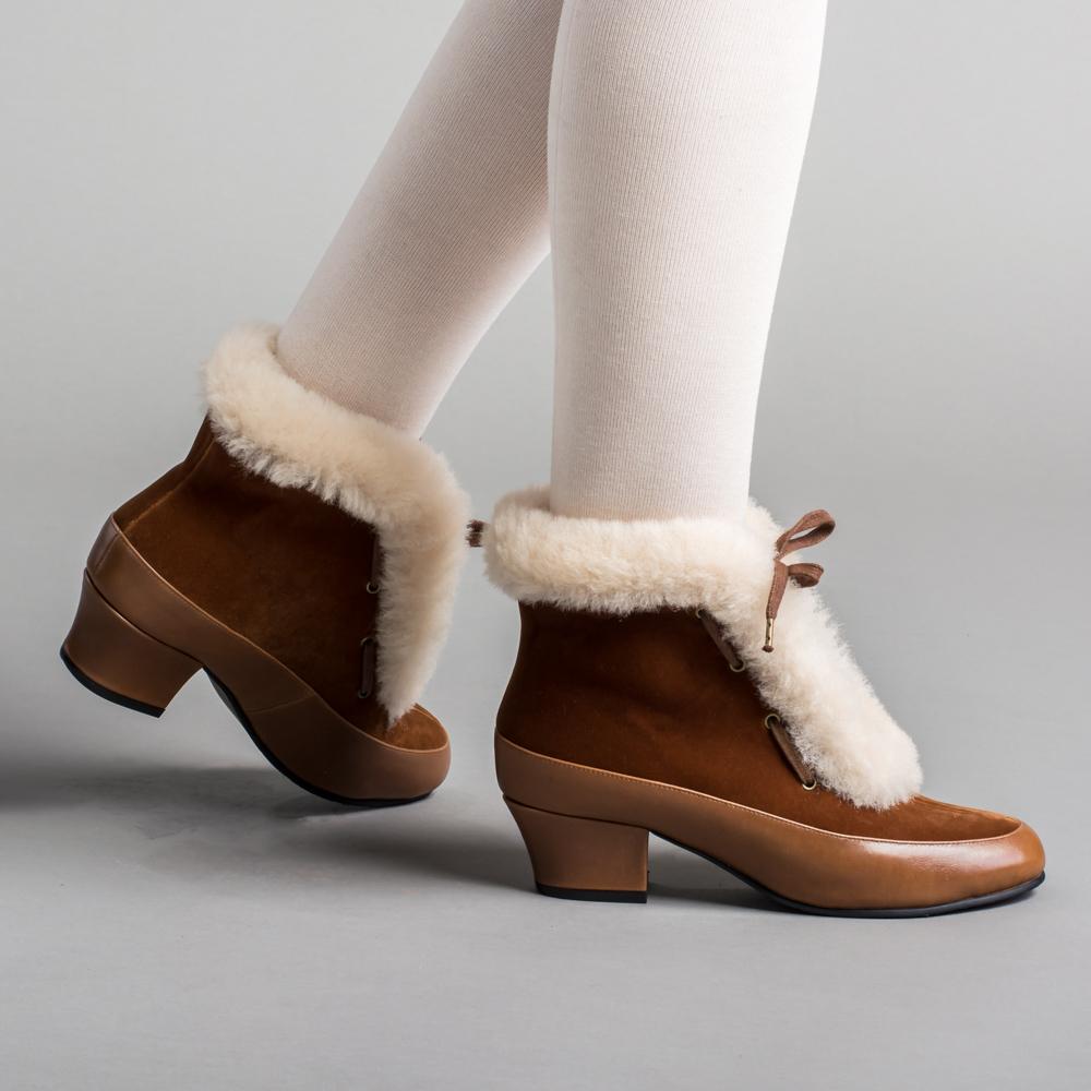 Alpen Retro Winter Booties are just the fashionable footwear you need for your winter vintage outfits. These booties are based on original Montgomery Ward overshoes, also known as galoshes, but are made as regular boots. We've stayed faithful to the velveteen upper and houndstooth lining, opting to use ethically sourced sheepskin trim and leather foxing and heel. These beautiful boots are cozy and practical for winter wear, with rubber soling.
