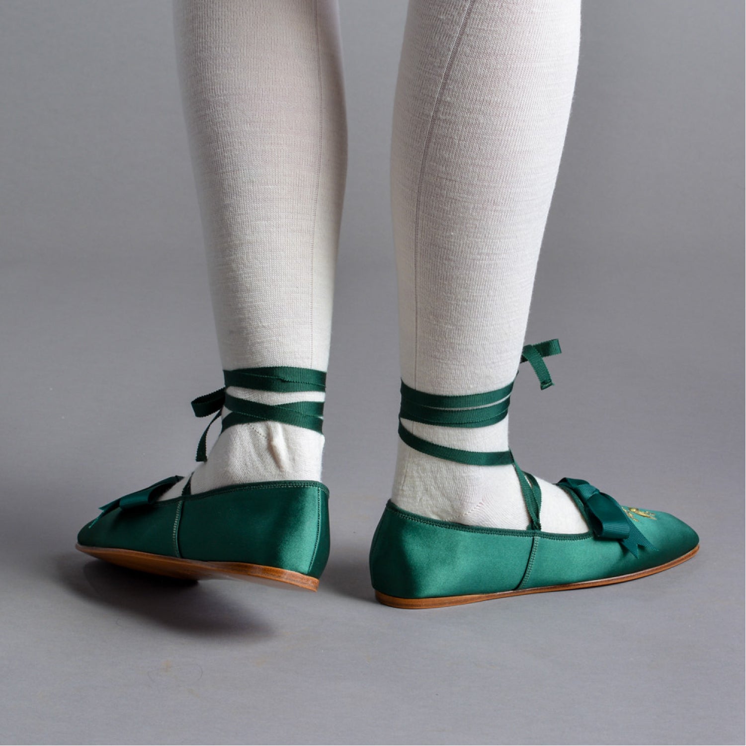 • Petersham binding, ankle ribbons, and bow