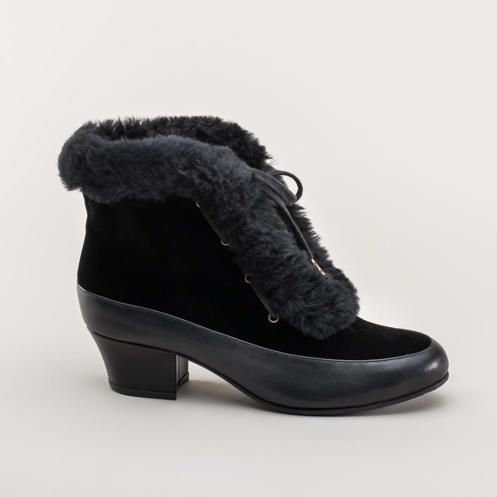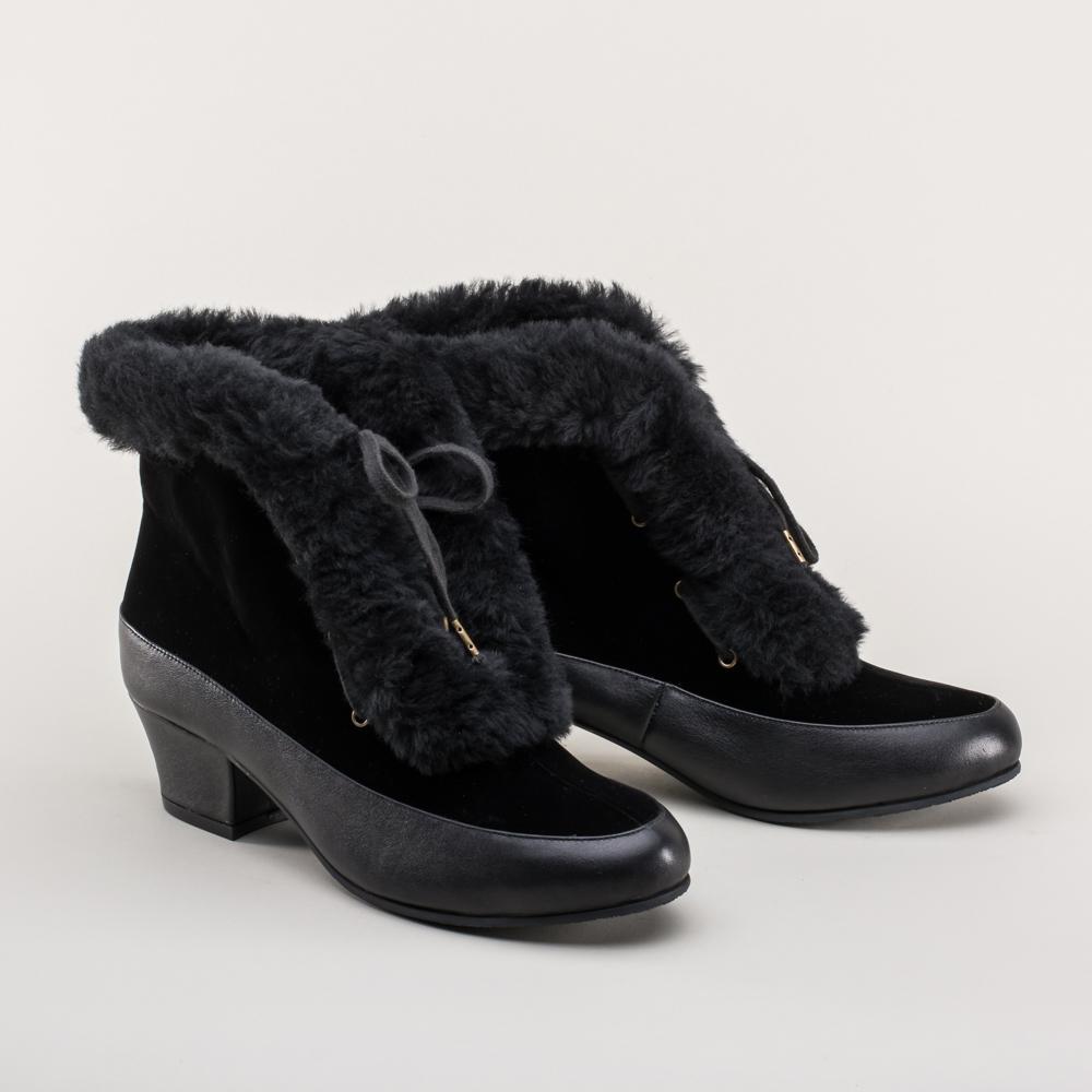 Alpen Retro Winter Booties are just the fashionable footwear you need for your winter vintage outfits. These booties are based on original Montgomery Ward overshoes, also known as galoshes, but are made as regular boots. We've stayed faithful to the velveteen upper and houndstooth lining, opting to use ethically sourced sheepskin trim and leather foxing and heel. These beautiful boots are cozy and practical for winter wear, with rubber soling.