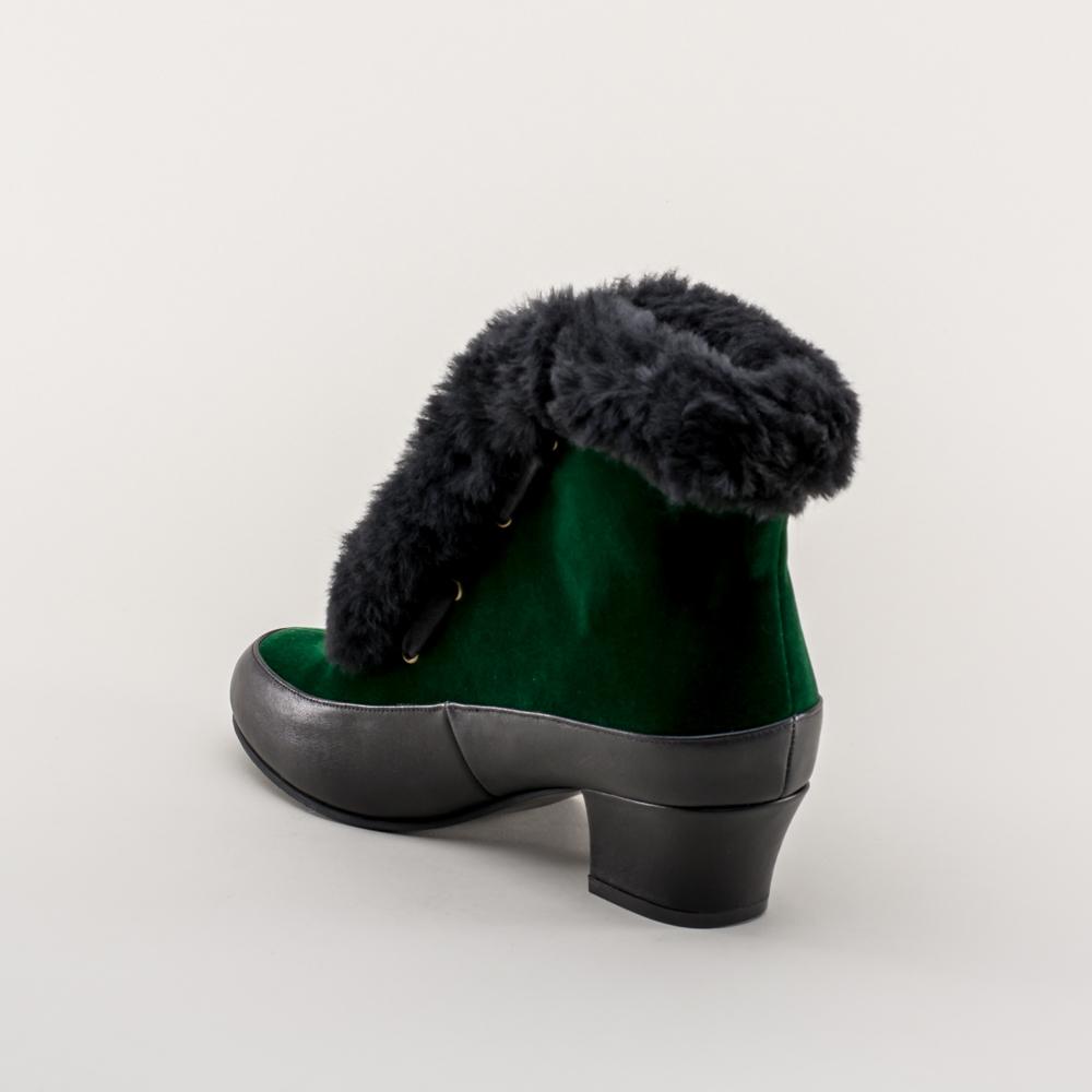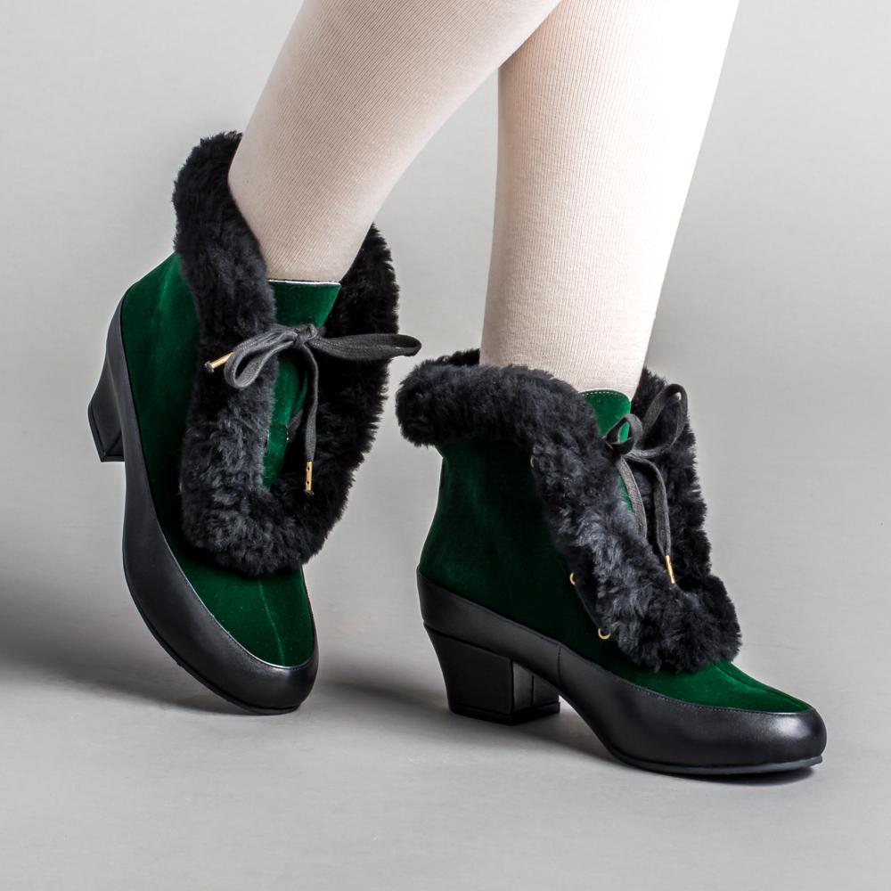 Alpen Retro Winter Booties are just the fashionable footwear you need for your winter vintage outfits. These booties are based on original Montgomery Ward overshoes, also known as galoshes, but are made as regular boots. We've stayed faithful to the velveteen upper and houndstooth lining, opting to use ethically sourced sheepskin trim and leather foxing and heel. These beautiful boots are cozy and practical for winter wear, with rubber soling.