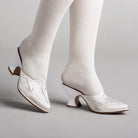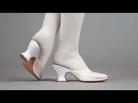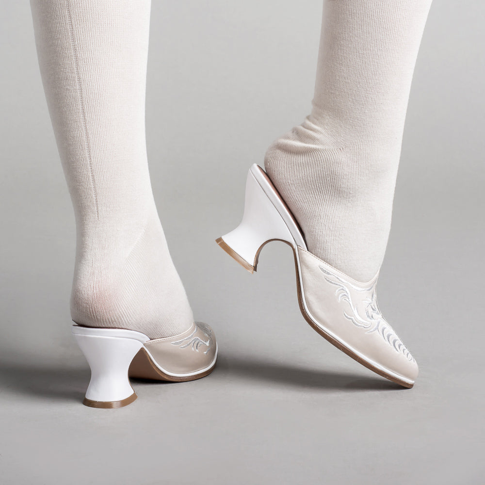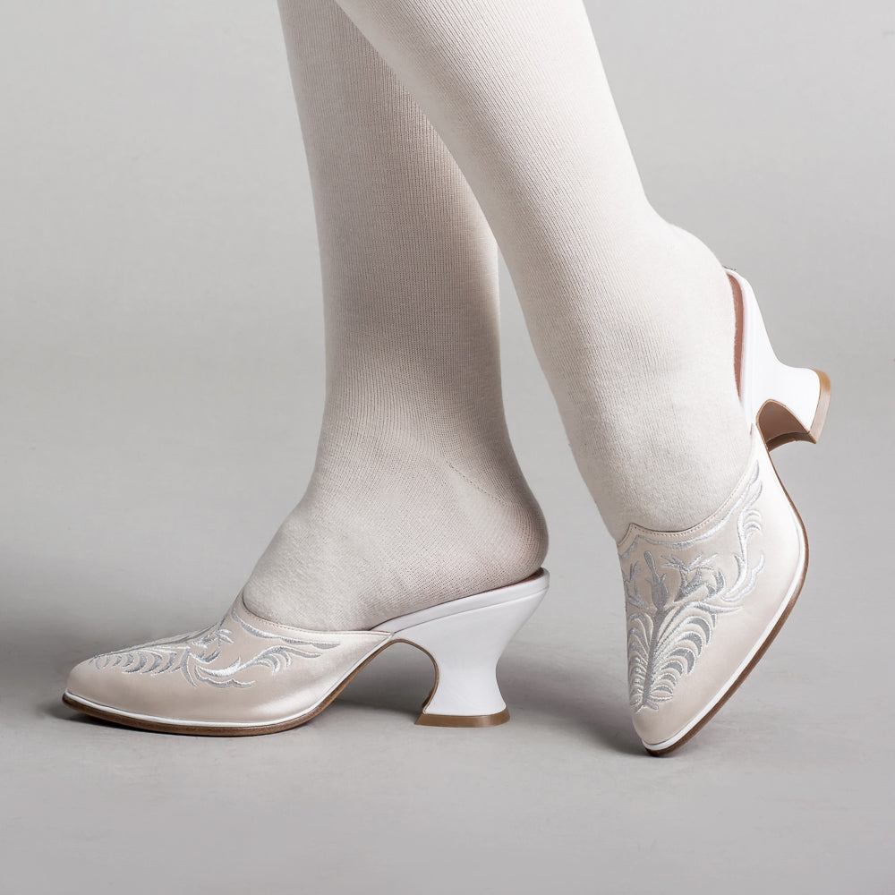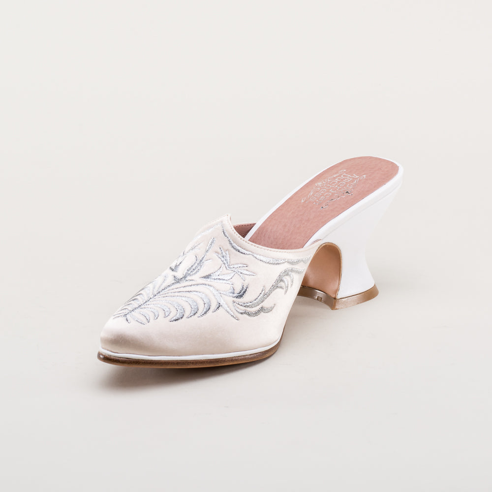 Antoinette 18th century mules present a gorgeous opulence in fancy footwear for your Georgian era impressions. Correct for c. 1700 - 1770s, these elegant backless heeled slippers are the ideal choice for fancy gowns fit for Versailles, with a superbly balanced French heel, leather lining for easy walking, and a softly pointed toe.