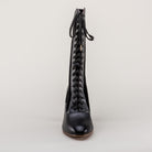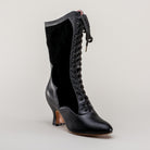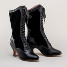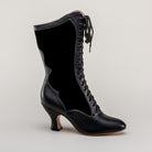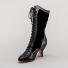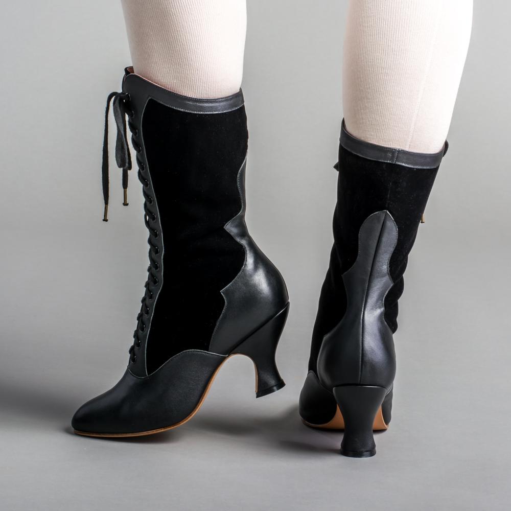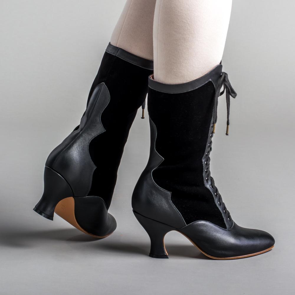 These tall boots feature a shaped top, leather foxing throughout, and a gorgeous 3 in / 7.6 cm French heel. Wear these beautiful boots with both historic dress and modern attire for a splendidly turn-of-the-century look with interesting details and gorgeous materials. The Camille boots, named after Camille Clifford, are perfect for reenactment, Can-Can, Goth, Lolita, and Western dress.