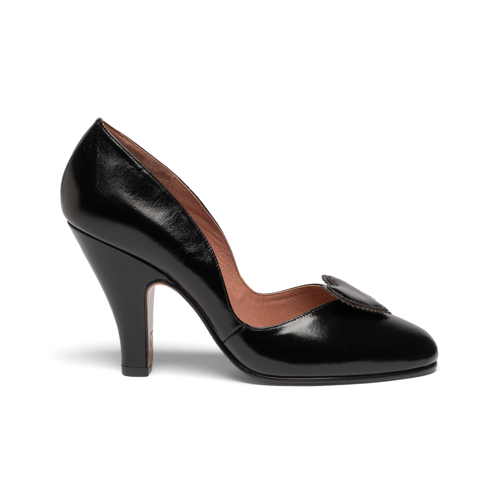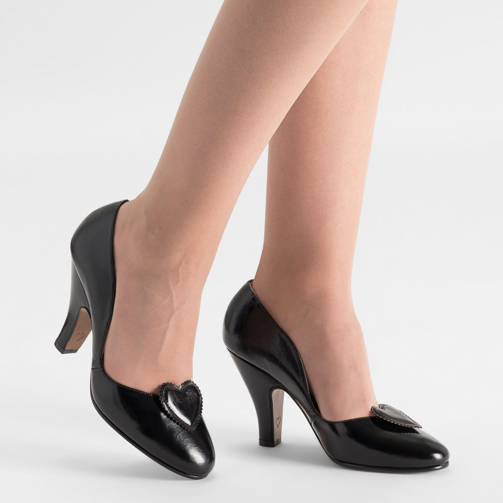 Meet Ginger, a seductive vintage pump that will set your heart aflutter! Marilyn's sophisticated cousin, Ginger is a shapely shoe that features deep, swooping curves that flatter the foot. The breast of Ginger's custom, 3.5" 8.9 cm Spanish heel is decorated with a darling debossed heart. Adorable heart-shaped shoe clips are easy to apply and remove, for added versatility. Pair Ginger with your favorite 1940s and 1950s ensembles, or with your contemporary wardrobe. This definitively fashionable shoe goes with anything and everything, from dresses to trousers, and fluffy petticoats to wiggle skirts.