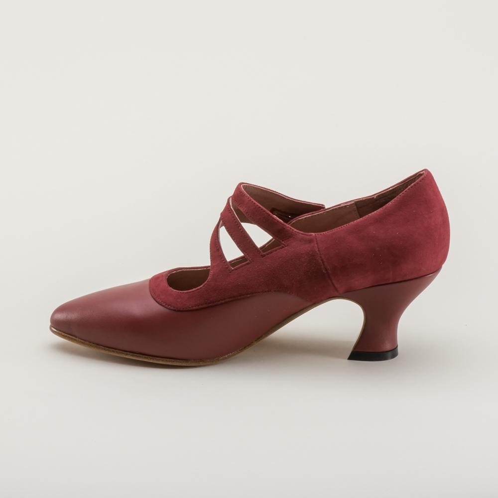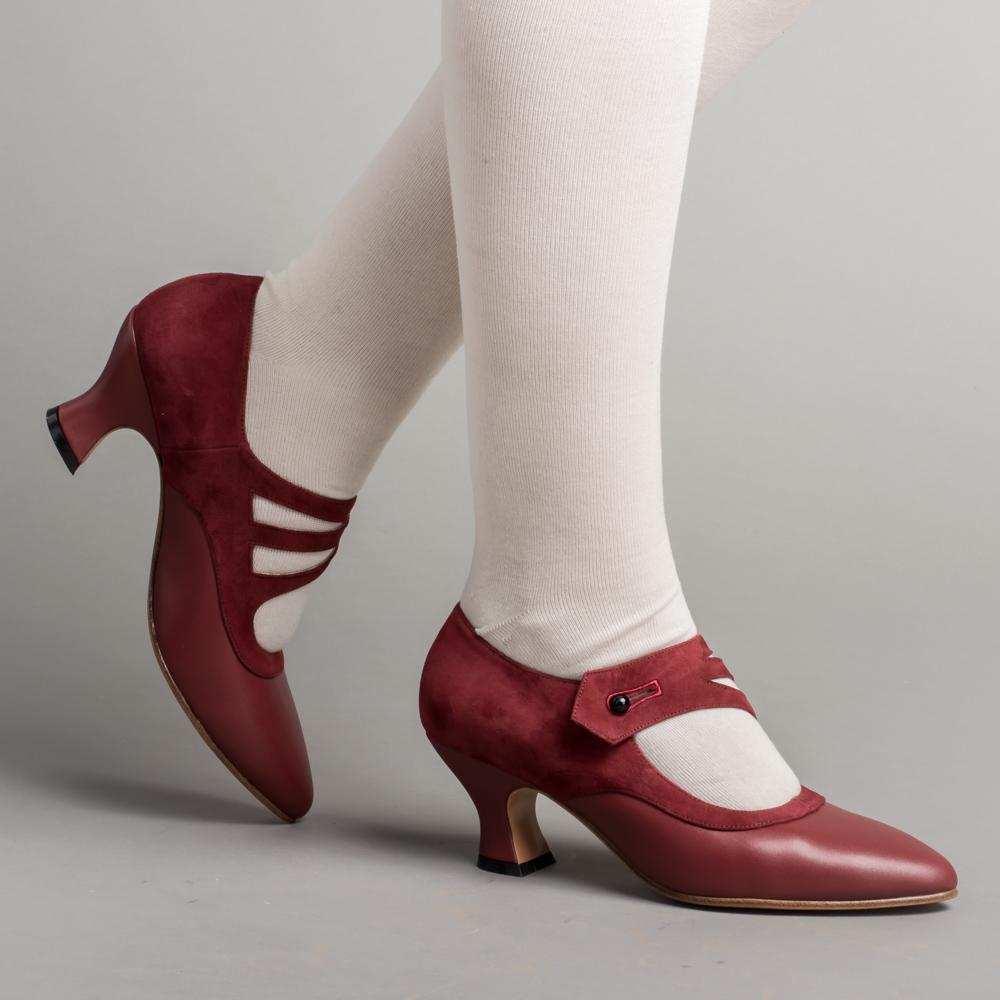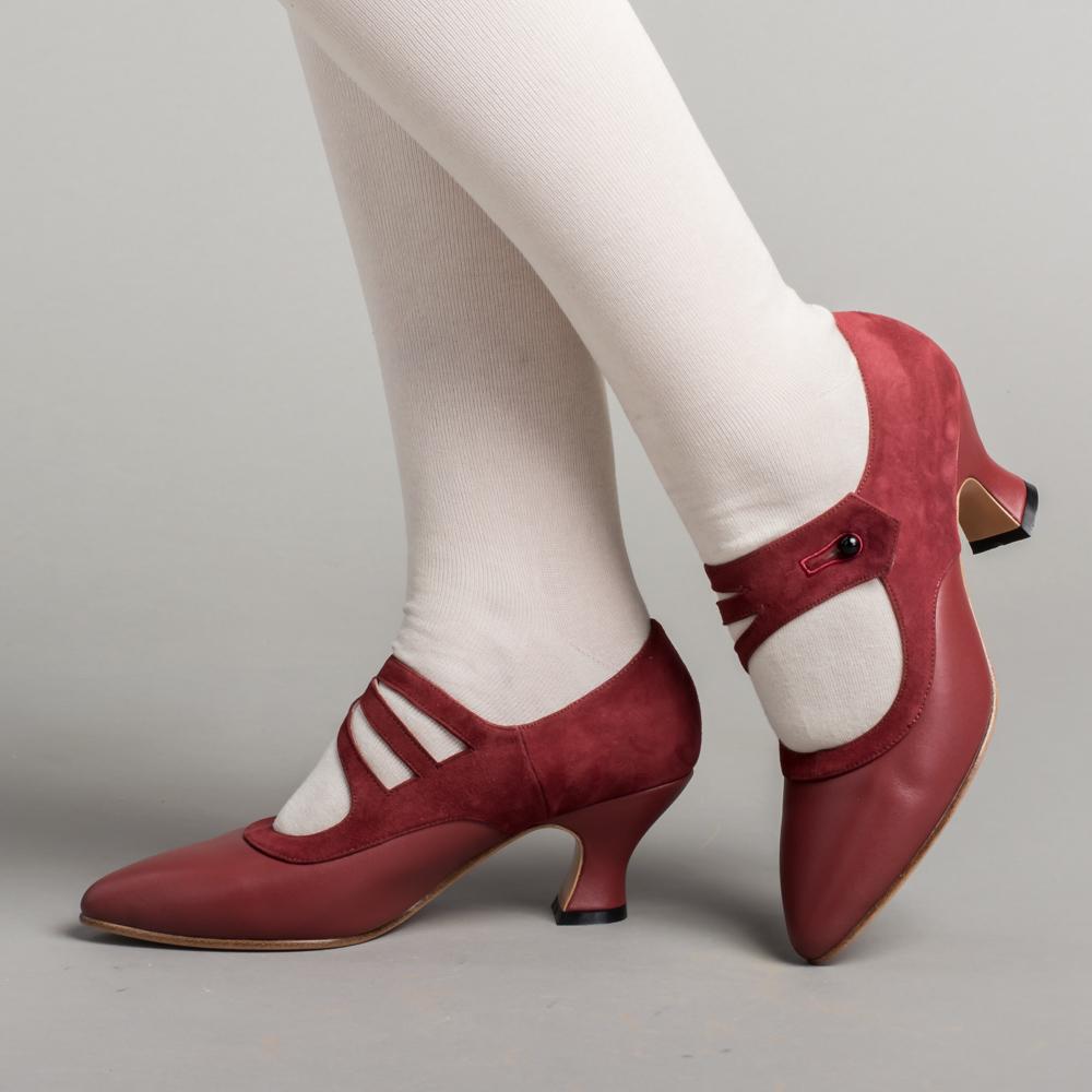 Developed directly from an original 1900s design, the Mae feature tone-on-tone suede and smooth leather with a sophisticated Mary Jane strap crossing elegantly over the instep. The 2.25 in / 5.7 cm French heel is delicate and well-balanced, paired with a pointed toe to create the perfect Edwardian and 1920s silhouette.