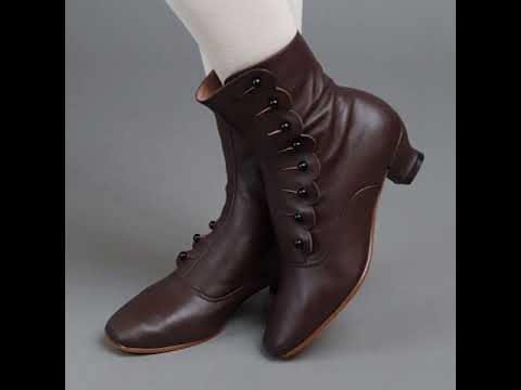 These mid-Victorian and Bustle Era boots have square toes, a short heel molded from an original, and an attractive scalloped edge and top, making them practical yet feminine, and ideal for a fashionable Victorian lady.