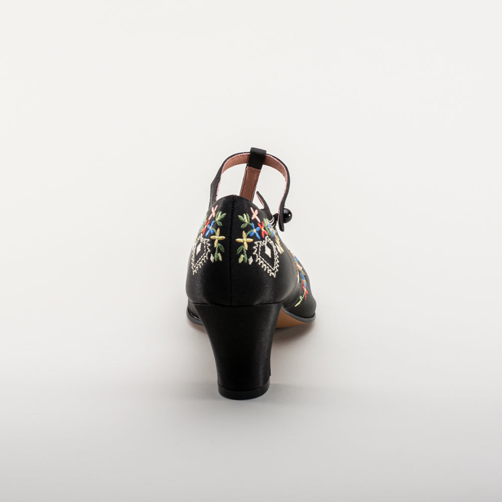 As hemlines rose in the 1920s, flashy footwear was all the rage, and the Daisy Embroidered T-Strap heels are just the ticket. Made in luminous satin heavily embroidered in a gorgeous botanical design, the Daisy T-Strap Shoes are closely based on an original pair in Bata Shoe Museum. These gorgeous shoes are accurate for the 1920s, 1930s, and 1940s, and offer our refined and stable 2.5 in / 6.3 cm Spanish heel paired with open sides and an almond toe.