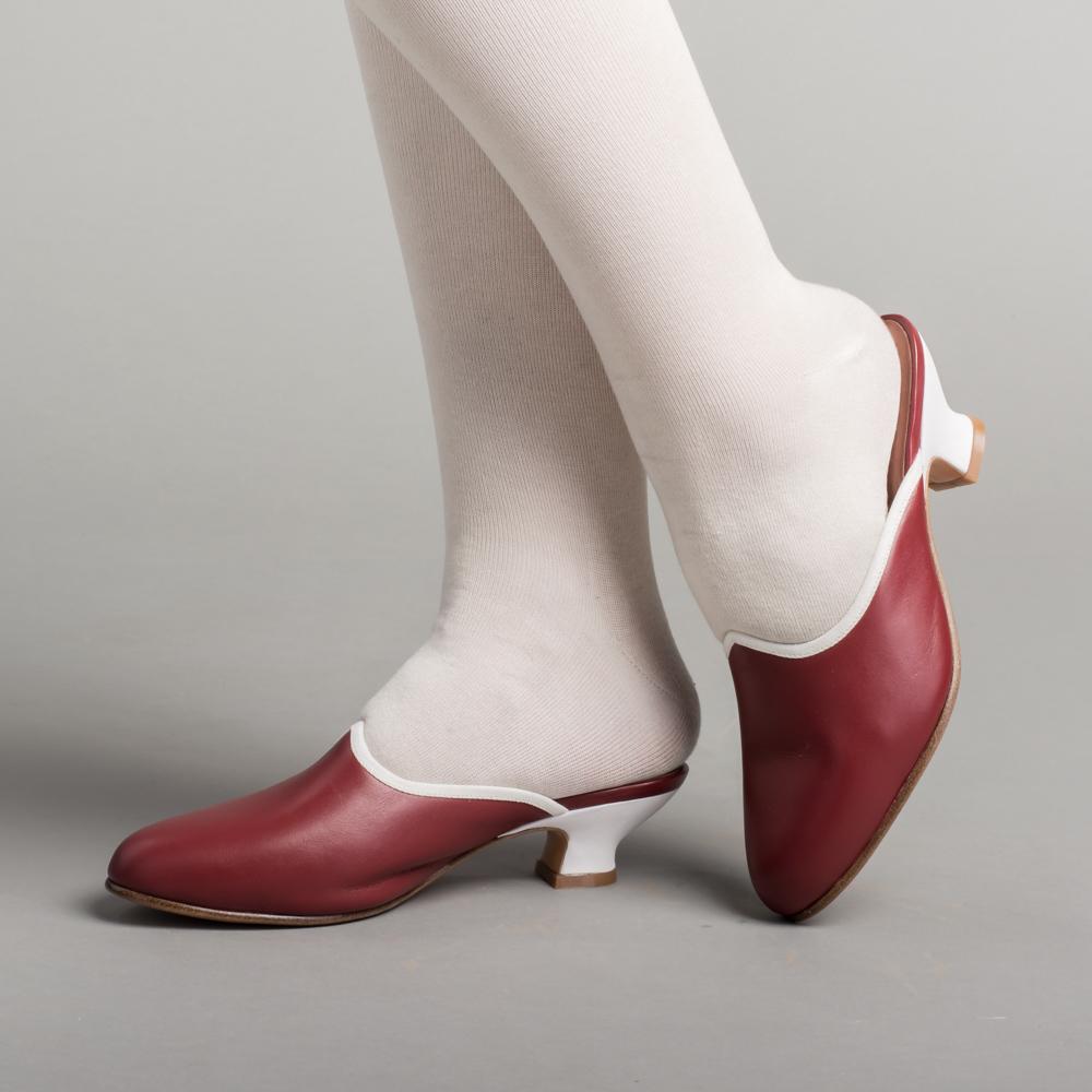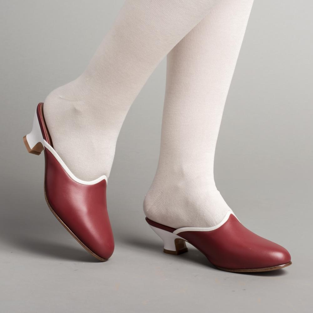 Sophie 18th century mules are the perfect slippers for your Georgian-era impressions. Correct for c. 1760s - 1790s, these adorable little backless mules work wonderfully for both working and upper class, with short 1.75" / 4.45 cm French heel, a shaped vamp, and softly tapered toe.