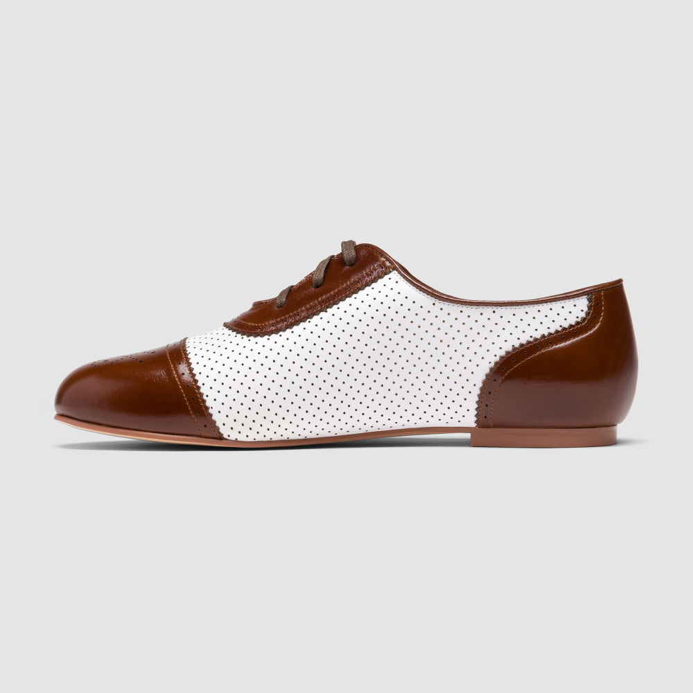 Fore! Look out for Beverly! These smart little flats are your go-to shoe for any activity. Based on vintage sporting shoes and flat-soled leisure footwear, Beverly has the vintage aesthetic you desire with all the comfort of contemporary footwear. Made from soft, flexible leather, Beverly molds beautifully to your foot. Beverly features perforated uppers with brogued heel counters and toe caps in fresh colors. Rubber soles and low rubber heels make Beverly durable and easy to walk in, whether you're trying your hand at pitch-and-putt or trekking across cobblestone streets on sightseeing expeditions.