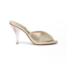 Put some spring in your step with Grace, a dazzling 1950s reproduction mule. These slip-on sensations are made with a period-accurate elasticated insole, which helps secure the shoe to the foot. Grace features our custom, one-of-a-kind, clear 1950s heel, bedecked with intricate etchings and a sparkling rhinestone. Choose from uppers in supple smooth leather, quintessential 1950s clear vinyl, or seductive hair-on cheetah print. Grace is fitted with a lightly treaded rubber sole, making her perfect for wearing poolside. Wherever you go, Grace is sure to turn heads!
