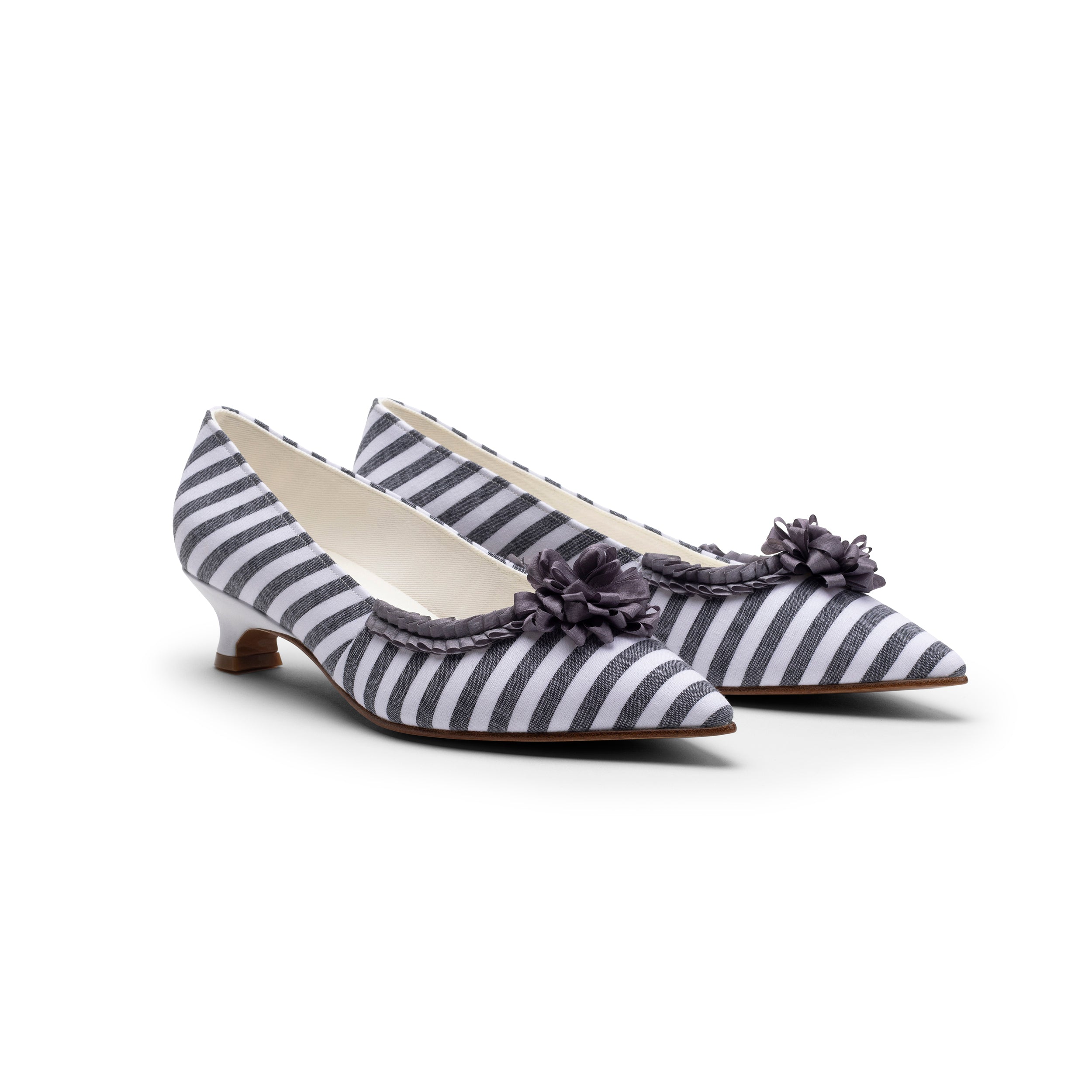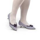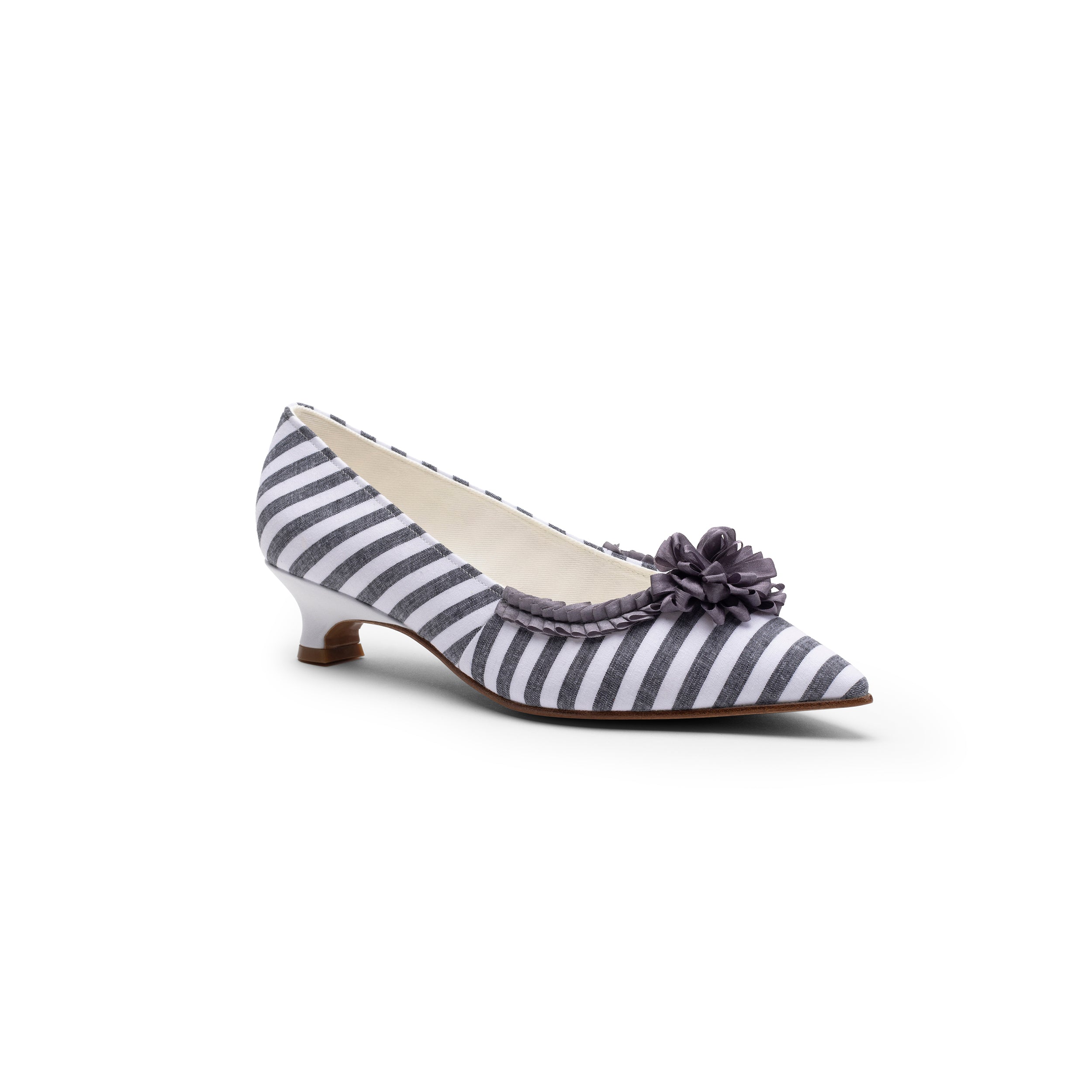 Josephine 18th Century Pumps are the ideal transitional shoe! Josephine is festooned with 100% silk ribbon pleated toe trim and rosettes. This jaunty pump's uppers are constructed in lovely striped cotton, with period-accurate side seams and a cotton twill lining. Featuring a distinctive tapered toe and brand-new, perfectly balanced 1.5"/3.81 cm leather-covered Italian heel, Josephine is a fine fit for your favorite late-18th century impressions and costumes.